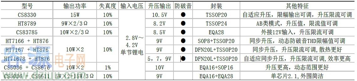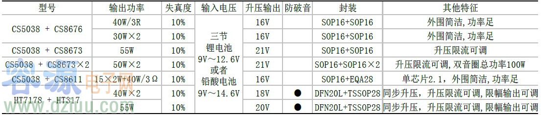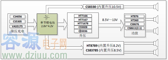 電池供電藍牙音箱以及便攜式廣場舞音箱功率越做越大。因為相關充電電路成熟穩定,供應鏈的配套,成本要求等因素,單節鋰電3.7V,雙節鋰電7.4V,三節鋰電或者鉛酸電池12V供電是市場應用主流的方案。3.7V,7.4V,12V直供輸出功率有限,所以升壓后再給功放供電是提升輸出功率的主要方式。由于升壓效率,功放效率的存在,以及芯片封裝熱阻的局限性,內置升壓功放芯片能解決一部分的應用要求,如果功率再大現階段最合理,最可靠的做法是外置升壓+音頻功放。為適應市場需求,深圳市永阜康科技有限公司整合優勢資源針對各種應用整理方案如下: