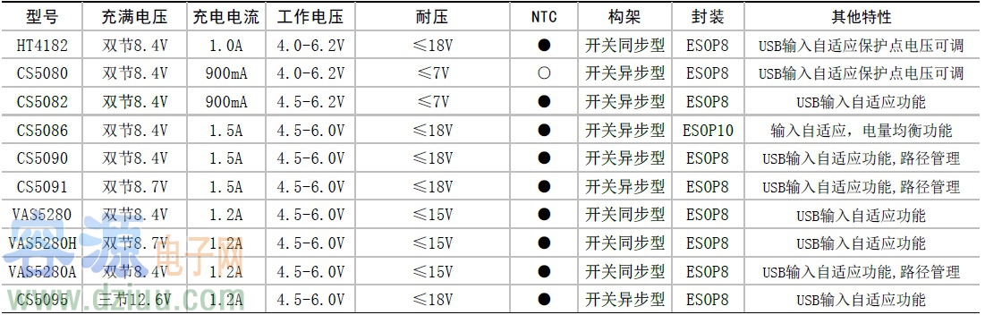 升壓型充電管理選型表(5V USB輸入,省掉適配器):
