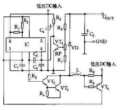 如圖3-47是用555定時器組成升壓型開關穩壓器。工作時,C1交替地放電。電阻R1設置最低開關頻率。當C充電時,經IC定時器的3腳驅動達林頓對管VT2,VT3供給電感線圈L形成電流回路。在電感L的電流達到由R8和VT4的基-射極所確定的導通電壓時,VT4的集電極電流會加速C1的充電。