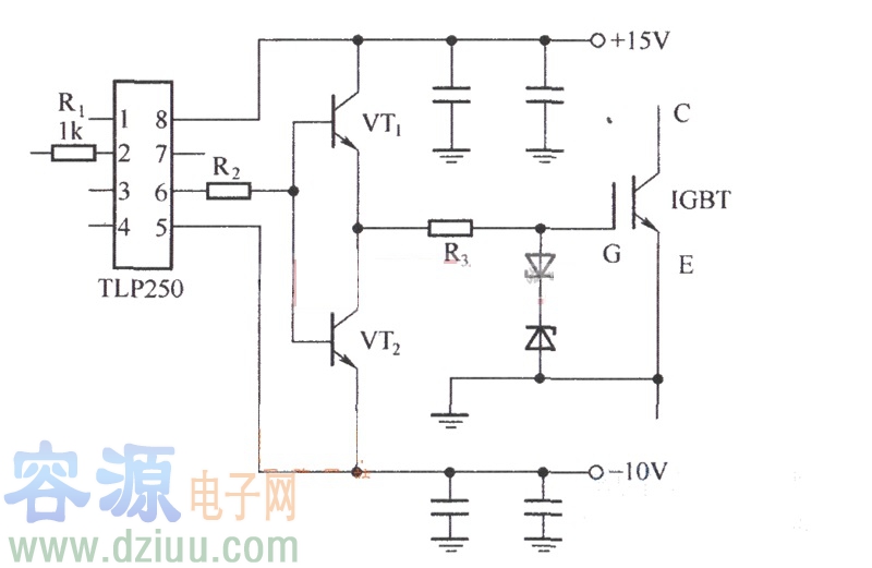 TLP250驅動電路圖、IGBT驅動電路 在分立式IGBT驅動電路中,分立元件多、結構復雜、保護電路復雜、可靠性和性能都比較差,因此在實際應用中大多數采用集成驅動電路。常用