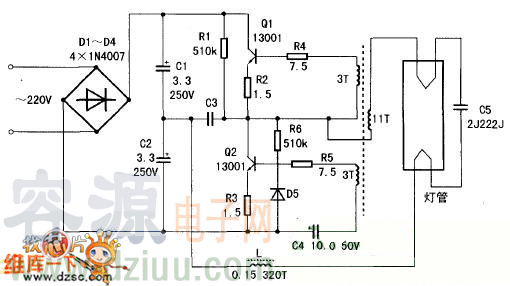 本電路特點是全部應用散器件制作,沒有用到集成電路,其主要器件是13001三極管作為控制器件,電路元器件少,制作簡單,制作成功率高,電路圖如下: