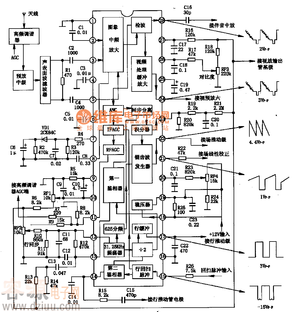 MCI3007是美國摩托羅拉(MOTOROLA)公司生產的、采用先進的氮化工藝和數字分頻技術的大規模單片集成電路。其內部包含了200個線性電路和200個邏輯門電路,可用來完成除伴音信號以外的所有小信號處理電路。它包括:中