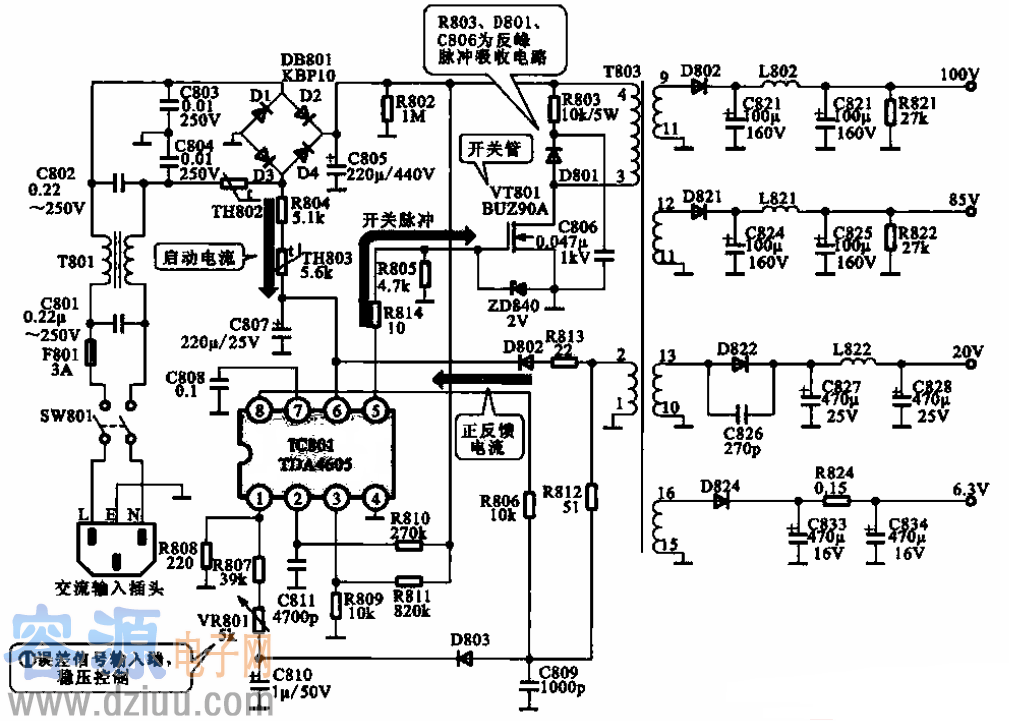 上圖所示是采用TDA4605的開關電源電路,這種電源電路的結構與彩色電視機的開關電源電路基本相同,屬于典型的開關電源電路之一。