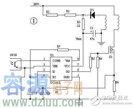 電源電路圖UC3842開關 當NMOS管導通時,初級線圈N1電流線性增大,磁場增強,次級線圈中VD4截止,由電容C10向負載供電;此時,脈沖變壓器原邊回路中VD2亦截止,N1這時起