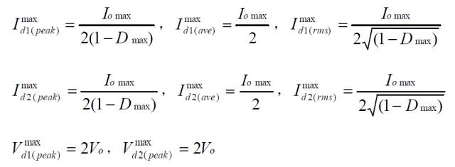 上述公式是穩態工作時,功率器件上的電壓、電流應力。選擇功率器件時,其電壓耐量可放一個合適的余量(保證最壞情況下的電壓峰值不超過此值),電流耐量則得按器件的結溫降額要求決定、它與外部散熱條件和器件的通態電阻、通態壓降、結電容、反向恢復、結到殼的熱阻等密切相關,是功率器件熱設計的內容,將在以后的欄目中介紹。
