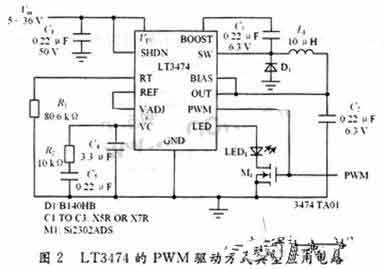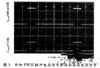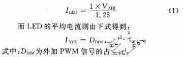 圖3所示為在PWM調(diào)節(jié)方式下,外加PWM脈沖驅(qū)動信號和輸出驅(qū)動電流的測量結(jié)果。從圖3中可以清楚地觀察到LED驅(qū)動電流是受外加PWM信號的控制。其中REF管腳的輸出參考電壓為1.25 V,如果將VADJ與REF管腳短接,則輸出的額定LED驅(qū)動電流為最大輸出電流(1 A)。對LED的額定驅(qū)動電流JLED的調(diào)節(jié)是通過改變VADJ管腳的電壓而實現(xiàn),可以通過將REF所輸出的1.25 V參考電壓分壓而完成。輸出LED的額定電流由下式得到:
