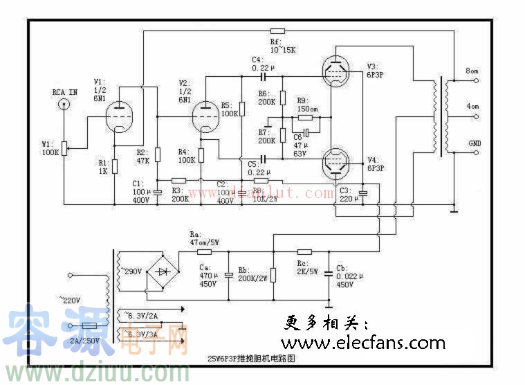電路是常見的一級輸入放大加長尾倒相推動功放管。小管子是國產的6N1,功放管子也是國產的6P3P,輸出功率是25W。 6P3P:旁熱式陰極束射四極管/低頻功率放大。 :