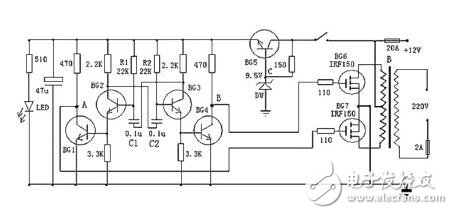 下圖較為容易制造的逆變器電路圖,能夠?qū)?2V直流電源電壓逆變?yōu)?20V市電電壓,電路由BG2和BG3組成的多諧振蕩器推進(jìn),再經(jīng)過BG1和BG4驅(qū)動,來控制BG6和BG7工作。其中振蕩電路由BG5與DW組的穩(wěn)壓電源供電,這樣能夠使輸出頻率比擬穩(wěn)定。在制造時,變壓器可選有常用雙12V輸出的市電變壓器?梢罁(jù)需求,選擇恰當(dāng)?shù)?2V蓄電池容量。