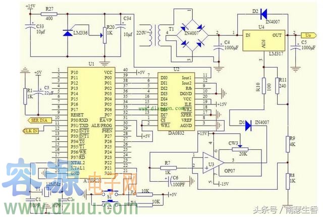 電路圖一: 整個電路通過單片機(AT89C51)控制,P0口和DAC0832的數(shù)據(jù)口直接相連,DA的CS和WR1連接后接P26,WR2和XFER接地,讓DA工作在單緩沖方式下。DA的11腳接參考電壓,通過調(diào)節(jié)