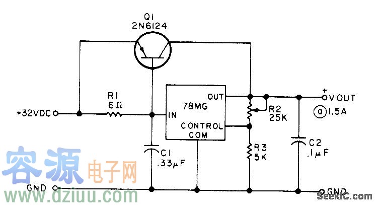 外部串聯(lián)旁路晶體管將500mA的78MG或79MG額定輸出提高到1.5A,以適用于實驗室可調(diào)電源。該電路的外部旁路晶體管無短路保護,但文章介紹了怎樣添加具有保護作用的晶體管來避免短路。 :