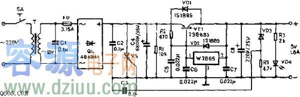 接通電源,電網(wǎng)電壓220V經(jīng)變壓器T變壓,由橋式整流器QL整流、電容C3濾波,使輸出端得到5V的穩(wěn)定電壓。W7805的最大輸出電流為1.5A,要想使輸出電流達到>1.5A,則要擴大輸出電流。這此,在W
