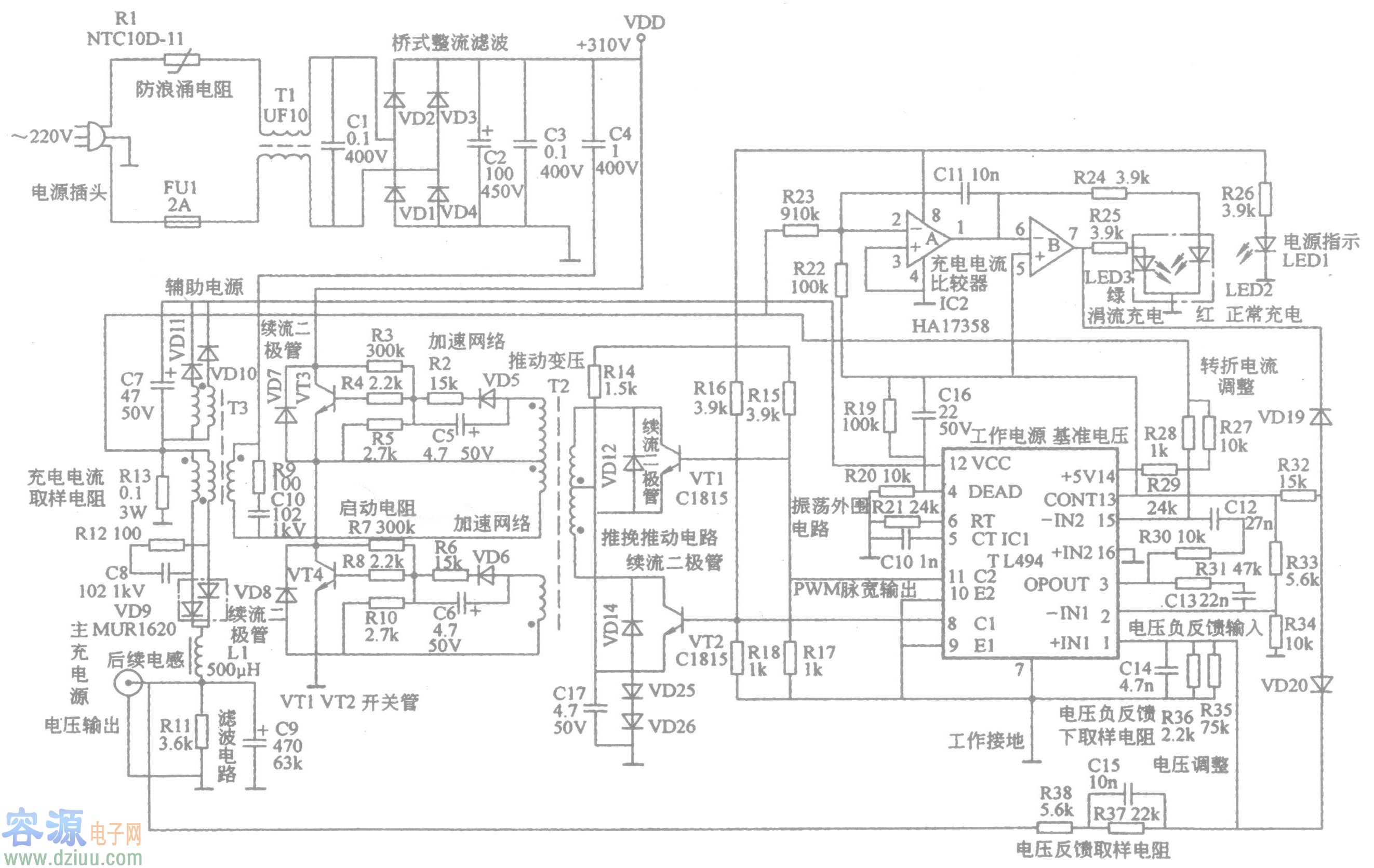 以下為電動自行車達事捷充電器電路圖,本電路僅供參考。 電動自行車達事捷充電器電路圖