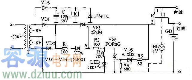 “千里眼”充電器電路如圖所示。其中單向晶閘管 VS1為電瓶GB的充電電流管,VS2為電瓶充電時作切斷充電電流之用。當接通電源充電時,繼電器K動作,觸點3與觸點2接通,VS1的觸發端從R1和