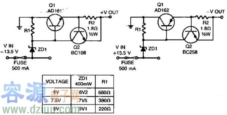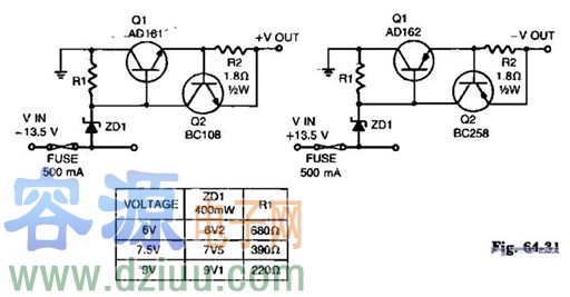 低電壓調節器短路保護電路,可提供6,7.5,和9 V從13.5 V標稱值,然而,他們將功能一樣好,如果連接到一個平滑的直流輸出變壓器/整流電路的汽車電池供電。 兩種類型的正反兩方面的地面系