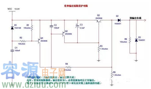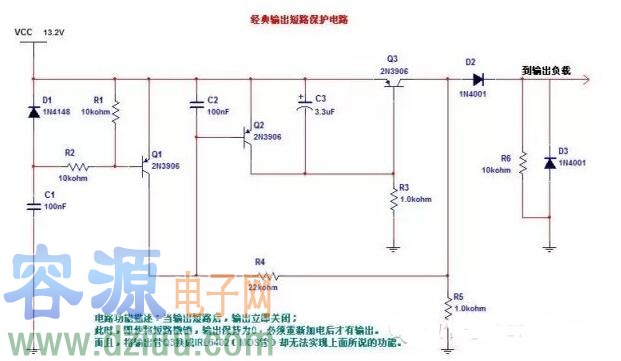 今天做了一個關于電機短路保護的電路,參考了經典電路: 這是一個自鎖的保護電路,短路時:Q3極被拉低,Q2導通,形成自鎖,迫使Q3截止,Q3截至后面負載沒有電壓,這時有