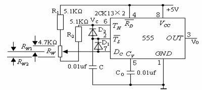 由555組成的感光式振蕩電路 如圖為由555組成的感光式振蕩電路。該電路用于探測閃電,可供盲人用作光雷達和報曉器等。555定時器的振蕩頻率隨光強度的增加而成正比例增加。當它工作在自由振
