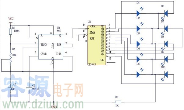 555定時器是一種模擬和數(shù)字功能相結(jié)合的集成器件,通過外圍元件的簡單組合,可以組成許多基本實用的電路,最基本且應(yīng)用最多的有單穩(wěn)態(tài)觸發(fā)器,施密特觸發(fā)器,多諧振蕩器三種! ”疚慕裉鞄硪豢顚嵱玫腖ED流水