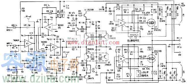 本文介紹一個由運(yùn)放和多個晶體管組成的10W功率放大器電路,如下圖所示,元件雖然多了一點(diǎn),但是失真度卻非常低。10W低失真運(yùn)放推動晶體管功放制作電路 電路中運(yùn)放的作用是電壓放大,晶體管VT1~VT7用于電流放