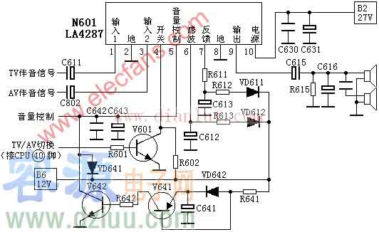 TV伴音信號從N601的(1)腳輸入,AV伴音信號從N601的(3)腳輸入,CPU(40)腳輸出的TV/AV的切換信號經R601送到V601的基極,由V601倒相后控制N601的(4)腳,經內部選擇后從N601的(9)腳輸出音頻信號,推動喇叭
