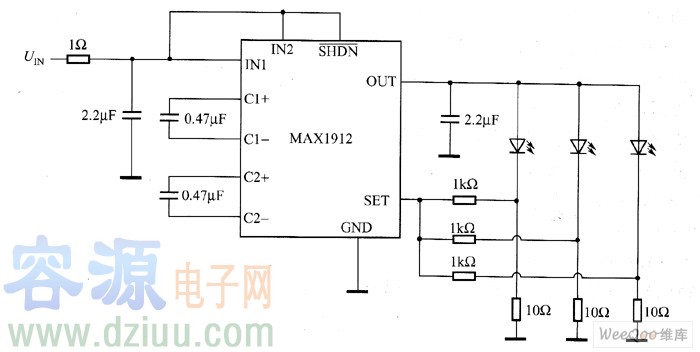 白光LED供電電源的目標是提供一個足夠高的輸出電壓,并且在并聯連接的白光LED上加載同樣的電流。如果并聯配置的所有白光LED具有一致的電流,那么所有的白光LED將會具有相同的色彩坐標。Maxim提供的帶有電流控制的