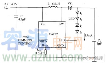 CAT32是一個DC/DC升壓變換器,它的輸出電流可調。當工作在1.2MHz的固定頻率下時,CAT32可使用電感值很小的外部電感器和電容值很小的陶瓷電容。 CAT32可用來驅動多個串聯的白光LED,并提供可調的電流來控制亮