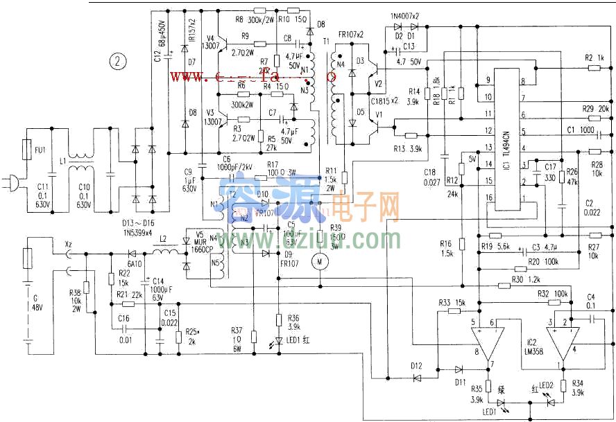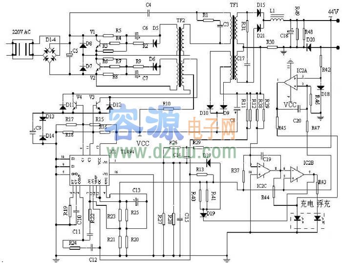 標簽:充電器電路圖文中介紹兩款充電電路,都是48V充電電路,應用LM494、LM358控制,電路圖如下: